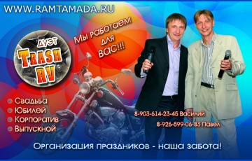 Шоу-дуэт "Trash RV" организует и проводит праздничные мероприятия, свадьбы, юбилеи, корпоративы. Предлагаем услуги по проведению, ...